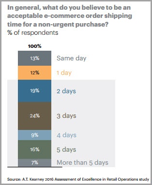 The 2016 A.T. Kearney Achieving Excellence in Retail Operations (AERO®) study sought to find the answer to this. When asked “what do you believe to be an acceptable e-commerce order shipping time for a non-urgent purchase?” the most common answer was “three days” (24%), with 68% of respondents answering between “two” and “five” days. The extremes of “same day” and “more than 5 days” only accounted for 20% of responses when combined.